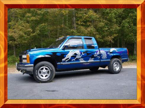 A silver dragon with black and purple accents on a blue GMC truck. |