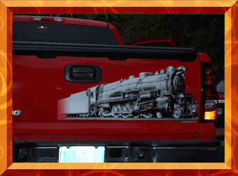 A digital print from an old train photograph addorns the tailgate of this truck. |